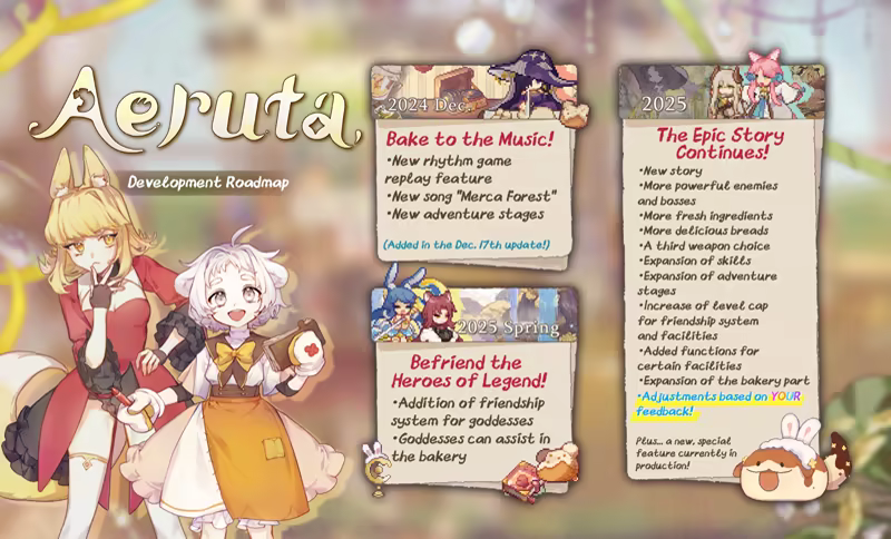 A bread revolution across the world now begins! Aeruta is a side-scrolling action game with a shop management twist, fight monsters for materials and use them to make breads, then finally make the deserted town popular again!