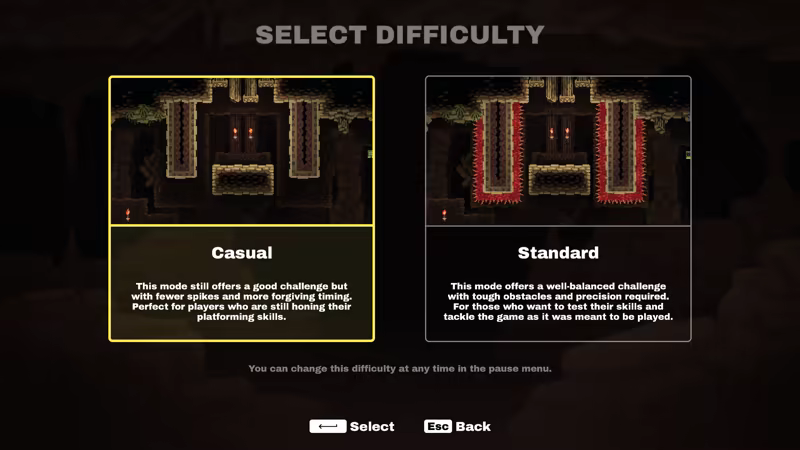 Простой режим предлагает более доступный опыт, с меньшим количеством шипов и более щадящими таймингами. Идеально подходит для игроков, не имеющих большого опыта в точных платформерах.