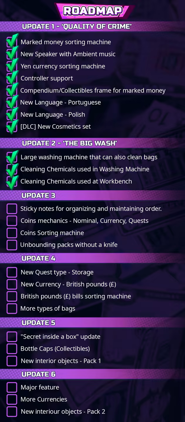 Используй стиральные машины, сушилки, счётные аппараты и другие инструменты, чтобы привести купюры в порядок. После чистки не забудь пересчитать всю наличку и отправить её клиентам… Ну, может, и не всю. Ведь деньги на деревьях не растут, а тебе они тоже нужны! Выполняй заказы, улучшай оборудование и осваивай новые методы работы с грязным баблом!