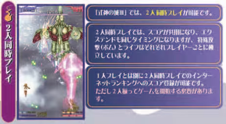 ・A culmination of character shooting games set in a unique worldview! ・A wide variety of newly added playable characters and attack methods, as well as a 2P scenario that is different from 1P play. ・Features a high-tension MAX system that will satisfy your insatiable passion for shooting games!