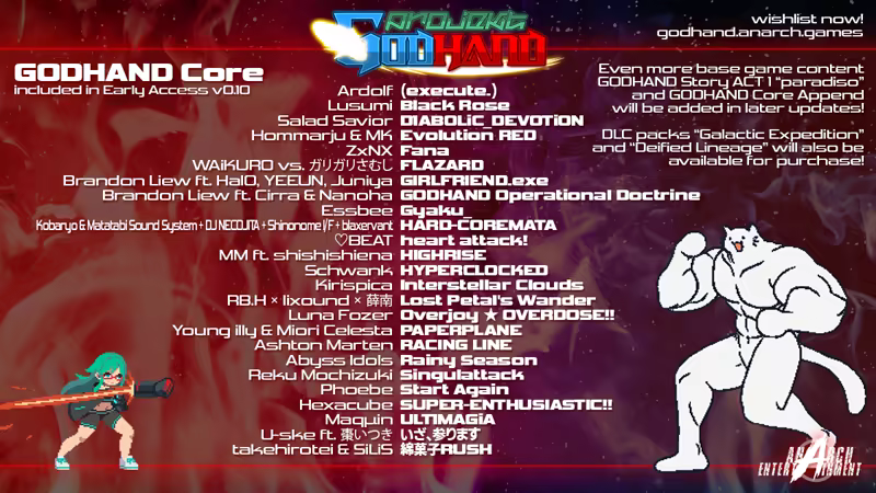 In GODHAND's Early Access version, experience 25 stages of keyboard smashing to cute pop songs, really fast hardcore, and really really really fast hardcore.