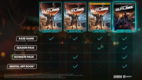 Купив "Максимальное издание" Star Wars Outlaws, вы получите игру, сезонный пропуск, максимальный комплект и цифровой артбук.*