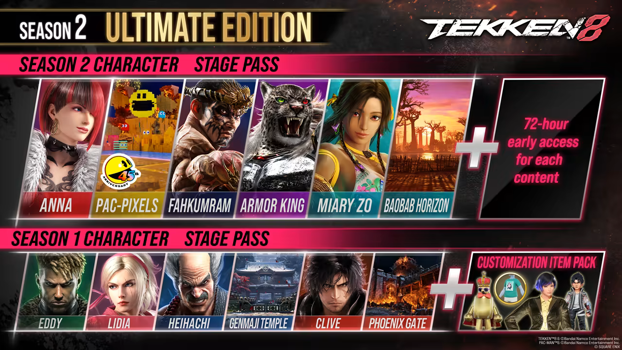 В Ultimate Edition сезона 2 входят следующие материалы: • TEKKEN 8 • 8 дополнительных бойцов – Eddy – Lidia – Heihachi – Clive – Anna – Fahkumram – Armor King – Miary Zo • 4 дополнительные арены – GENMAJI TEMPLE – PHOENIX GATE – PAC-PIXELS – BAOBAB HORIZON • 3 дня раннего доступа к дополнениям • Набор золотых костюмов персонажей • Комплект классических футболок TEKKEN для аватара • 4 Avatar Skins
