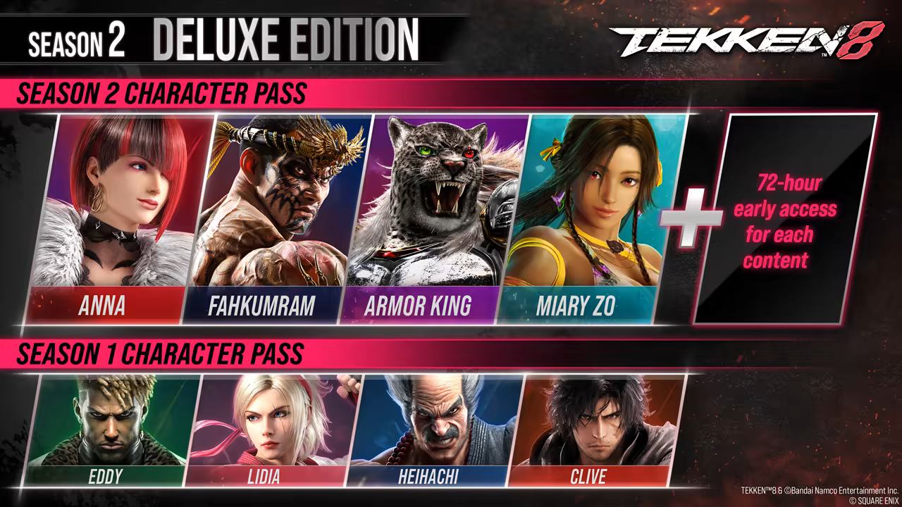 В Deluxe Edition сезона 2 входят следующие материалы: • TEKKEN 8 • 8 дополнительных бойцов – Eddy – Lidia – Heihachi – Clive – Anna – Fahkumram – Armor King – Miary Zo • 3 дня раннего доступа к дополнениям