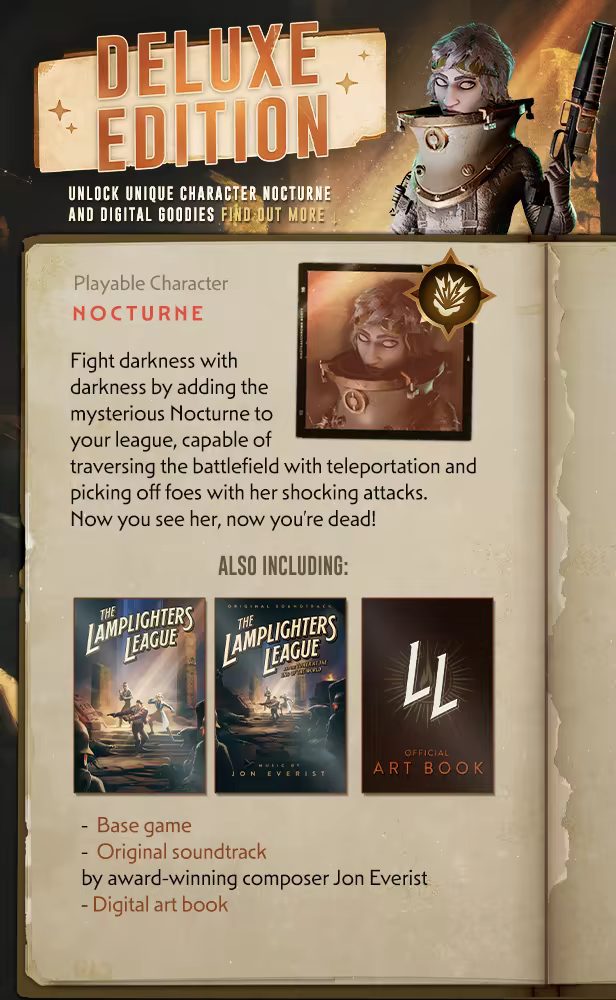 В Deluxe Edition входят эксклюзивный агент Ноктюрн, цифровой артбук по дизайну Лиги фонарщиков и полный саундтрек к игре от удостоенного наградами композитора Джона Эвериста. Соберите коллекцию и эффектно разберитесь с Опальными!