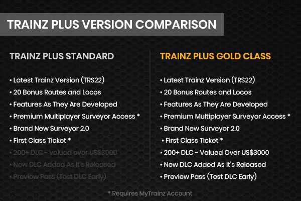 Stay ahead of the rest and be first to experience the latest updates and new content. You'll also enjoy a ongoing complimentary First Class Ticket for premium download speeds from the Trainz Download Station by choosing one of our Trainz Plus membership options.