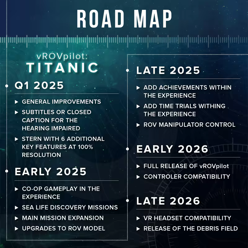 This experience offers a true-to-life depiction of the underwater environment, complete with particle effects and immersive "fog" to replicate the conditions in which the Titanic now lies. Navigate with precision using the ROV interface, developed in collaboration with expert ROV pilots to ensure realistic controls and tools for a seamless exploration.